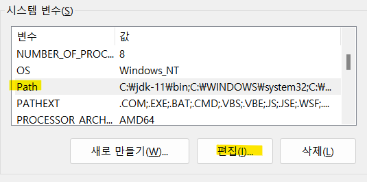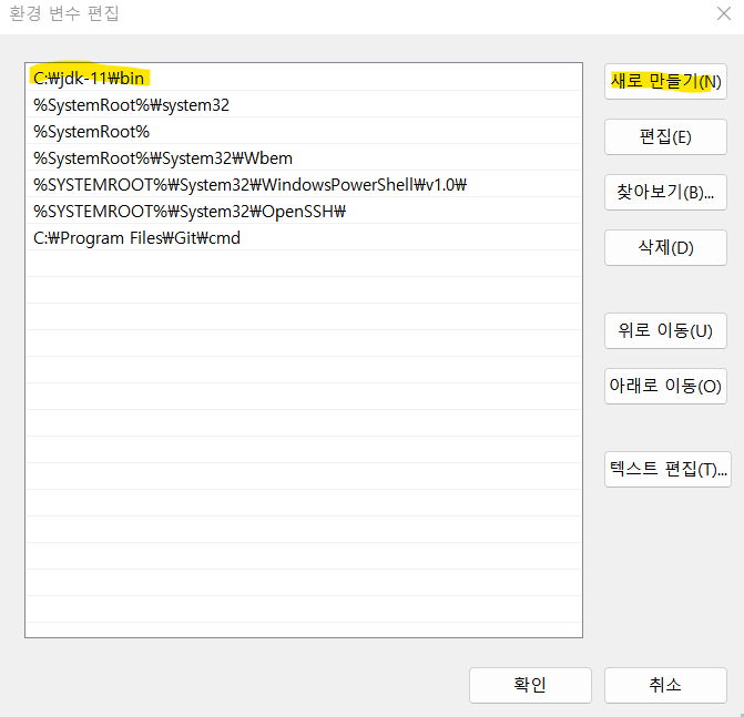 새로 만들기 > jdk/bin 경로 작성. ex) C:\jdk-11\bin > 확인