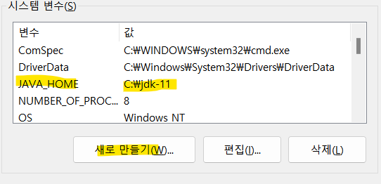 새로 만들기 클릭 > 변수이름: JAVA_HOME 변수 값: C:\jdk11 (jdk11 경로 작성하면 됨.)