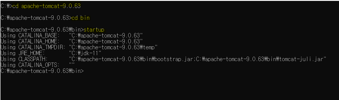 cmd > 톰캣 위치로 이동 > bin으로 이동 > startup