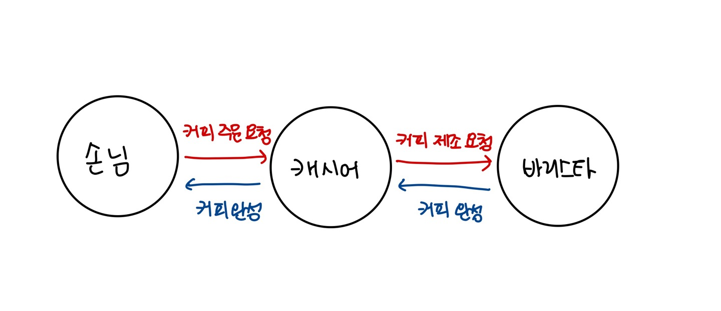 이 3명의 사람은 서로 요청을 하고 요청에 대한 응답으로 구성된 협력을 통해 '커피 주문'이라는 목표를 달성한다.